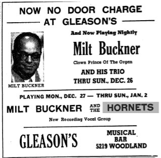 In late February 1961, the Hornets were at the Blackstone Cafe along with the 5 Quails. October of that year found them at Babe's Baby Grand.