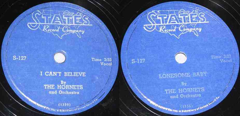 On April 18, 1954, the Hornets appeared as part of the Easter show at the local Circle Theater. Others on the bill were the Spence Twins ("Cleveland's own dancing darlings"), the Moonglows, the 3 Kats, Danny Cobb, and Ronnie Jarvis & His Calypso Band. A little blurb in the April 17 Cleveland Call And Post said: "Also featured in the revue is another singing group, The Hornets, who feature Blind Tommy Malone, Clevelander, at the piano. The Hornets are listed among the State Recording Company's stars, with 'I Can't Believe' and 'Lonesome Baby' already released and selling well." In spite of the wording, Blind Tommy Malone, who appeared all over Cleveland, was just used for backup; he wasn't a member of the group.