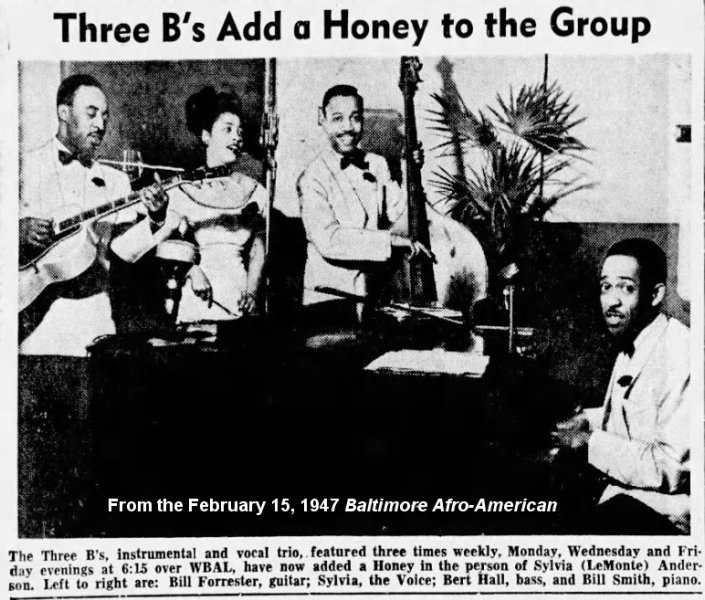 Our 3 B's were also out gathering Honey. Somewhere along the way (certainly by March 18, 1947, when they were playing the Astoria Musical Bar in Baltimore), they'd added Sylvia LeMonte (as noted in the March 15 Richmond Afro-American), but their radio listings continued as just the "Three Bees" (although the Astoria ad called them "the stars of WBAL"). Hold on, I found a photo of the group in the February 15, 1947 Baltimore Afro-American, which named the three men and told us that the WBAL 3 B's "have now added a Honey in the person of Sylvia (LeMonte) Anderson."