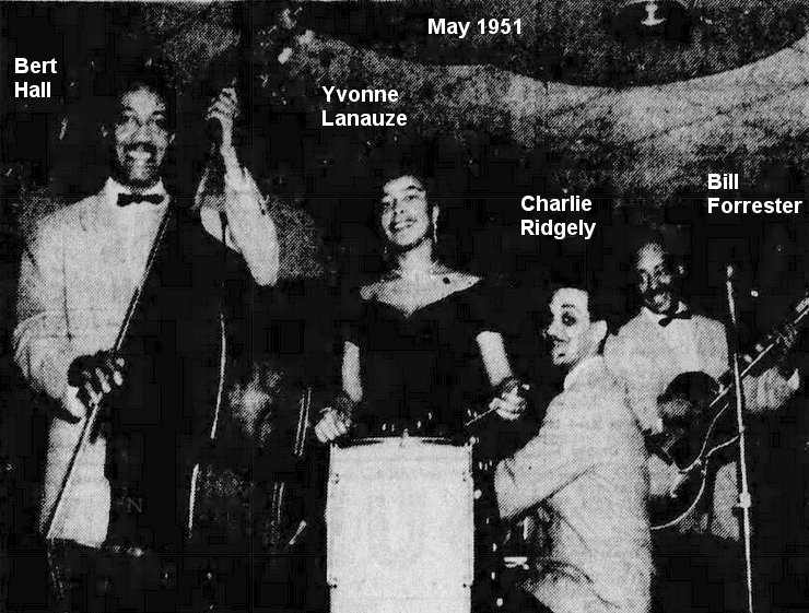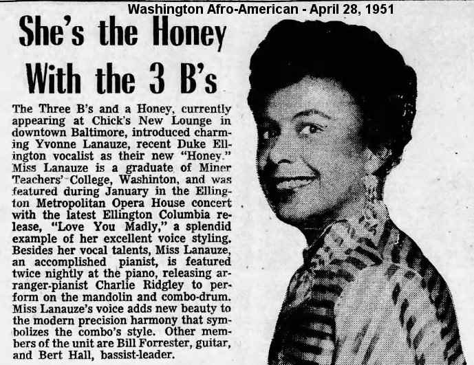 The April 10, 1951 Baltimore Afro-American had a nice photo of Yvonne and the accompanying article called her the group's new "Honey". (Note that "new" in this context is usually a relative term; she could have joined a couple of months previously.) They were at Chick's New Lounge (Baltimore), where she was featured at the piano with the 3 B's, "releasing arranger-pianist Charlie Ridgley to perform on the mandolin and combo-drum". Bill Forrester and Bert Hall ("bassist-leader") were also named. They never bothered to take new pictures with Yvonne, just cutting out her head from the Baltimore Afro-American article's photo and using it in a paste-up for ads.