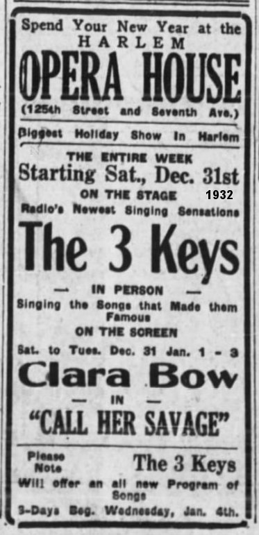 The December 31, 1932 New York Age said that they were now playing a return engagement at the Harlem Opera House, but I can't find any prior appearance there.