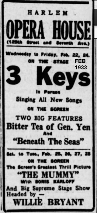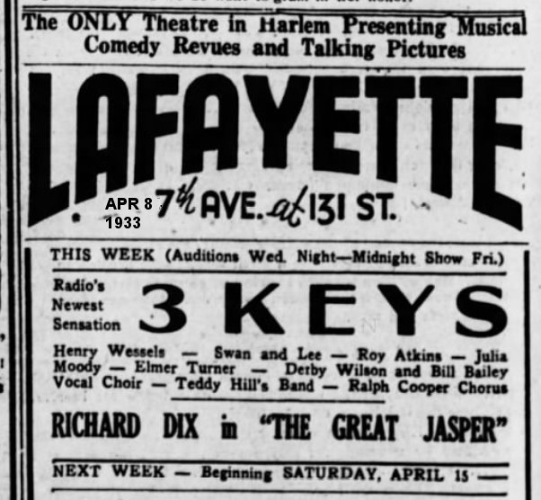 The Pittsburgh Courier of July 15 strangely said: The Three Keys have at last been given a break and are at the Academy Theater, New York, the last half of this week." Seems to me that they've had plenty of breaks before now and I don't know what's so special about the Academy Theater (which isn't mentioned once in any 1933 New York City paper. Possibly they meant the Brooklyn Academy Of Music.