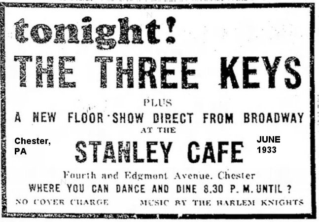 May and June 1933 found the 3 Keys appearing in various venues in Chester, Pennsylvania. On the 24th, they were at the Stanley Theater; on June 8, the State Theater; on June 26, it was at the Stanley Cafe.