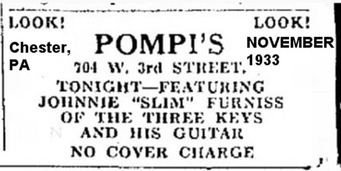 Only four days after returning, on November 18, "Johnnie 'Slim' Furniss of the Three Keys and his guitar" was appearing, alone, at Pompi's, in Chester. Where was Bob Pease? Nowhere to be seen.