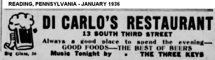On April 13, 1936, Bob, Slim, and Bon Bon were back at Drill's Cafe in Chester. They were still there on May 2, when the ad said "Three Keys And Their Band".