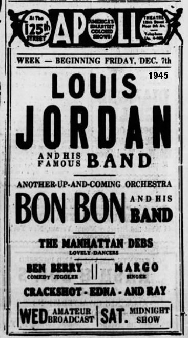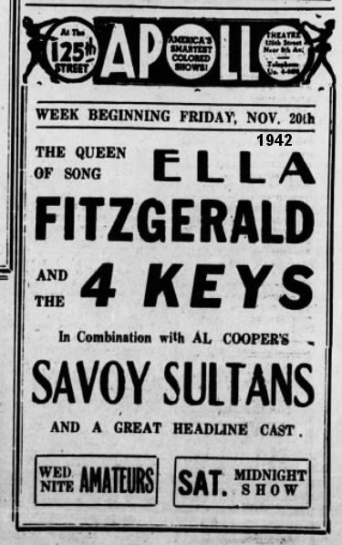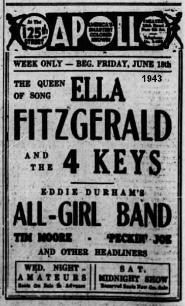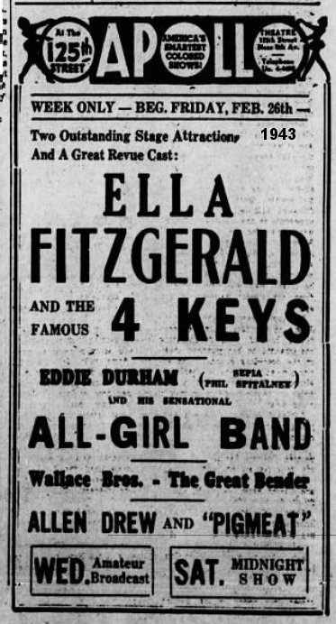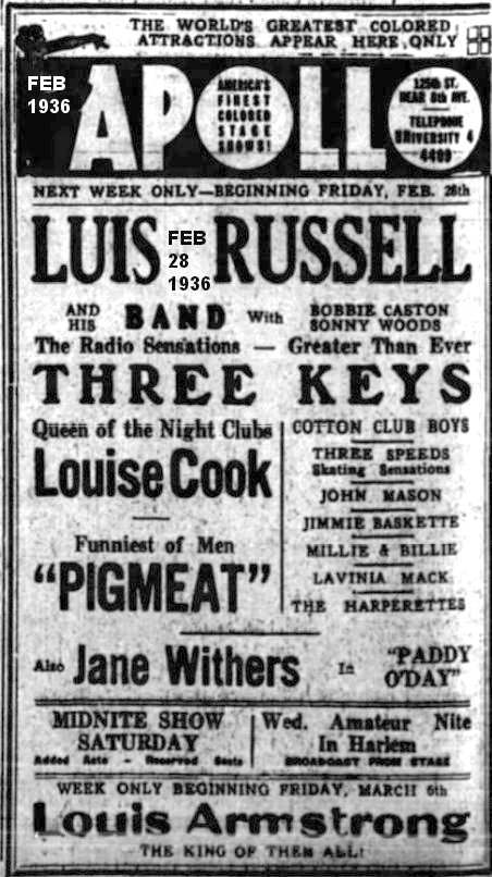 And then, the engagement everyone's been waiting for: they finally got to play the Apollo Theater the week of February 28, 1936. Also on the bill were Luis Russell's Band, John Mason, Jimmie Baskette, and Pigmeat Markham.