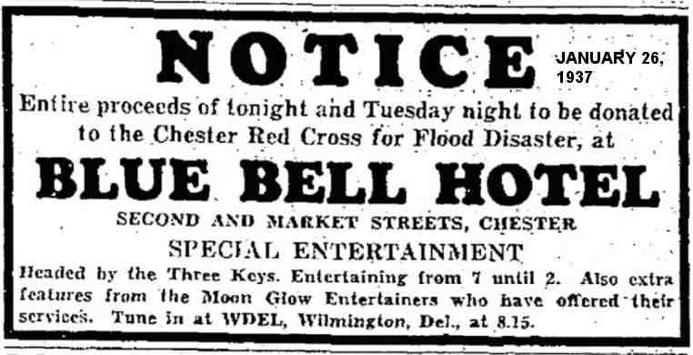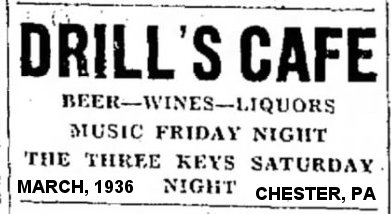 They performed at Drill's Cafe (Chester) on March 14, 1936. The next night, they entertained at a dinner given in the new Mercy Hospital, in Chester.