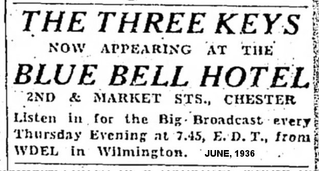I don't know who replaced Bon Bon, but the 3 Keys appeared at the Blue Bell Hotel, in Chester, on June 3, 1936. The ad asked us to "Listen in for the Big Broadcast every Thursday Evening at 7:45 E.D.T., from WDEL in Wilmington." Sure enough, on June 4 there was a listing for the 3 Keys. They remained on through July 30.