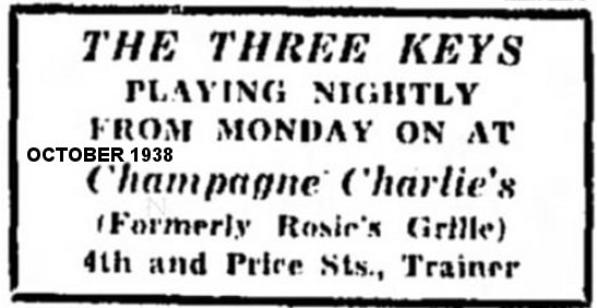 On June 16, 1934, they were at the Bonnie Brae in Massillon, Ohio. October 16 found them at the Chelsea Country Club in Chelsea, Pennsylvania. Not exactly the Grand Tour we were promised. (Note that there was another group called the 3 Keys that played venues in Sayre, Pennsylvania. This was "H. Shafer & His Three Keys". Then, there was the Three Keys Dance Orchestra; a local group from Mount Carmel, Pennsylvania.)