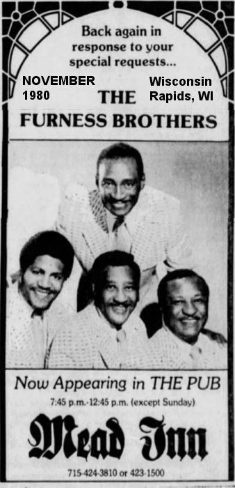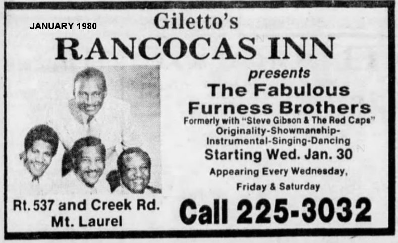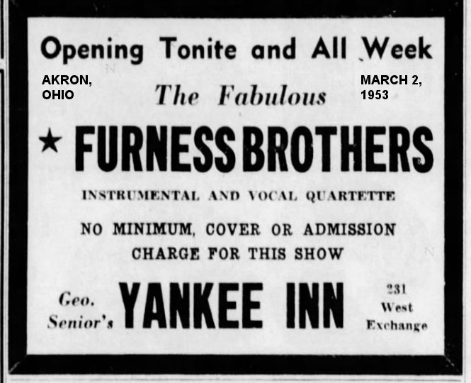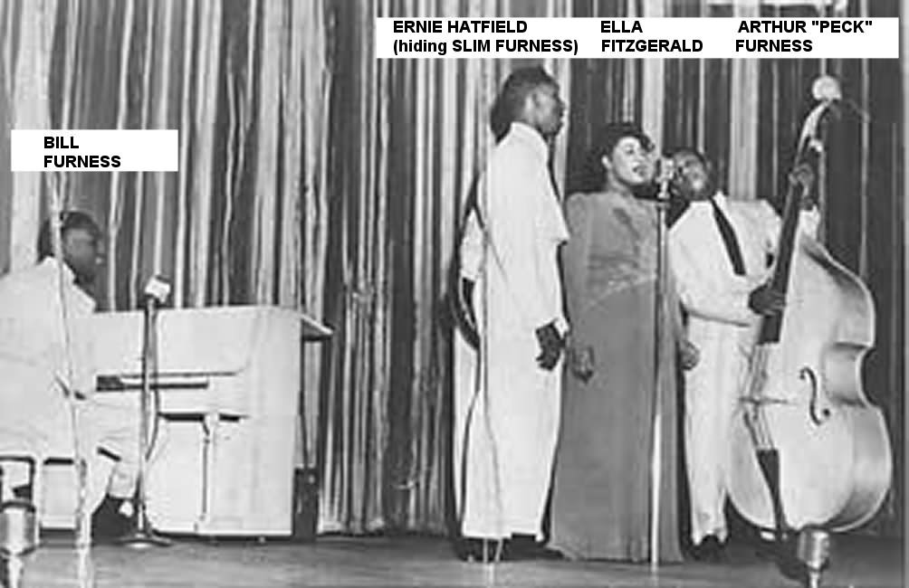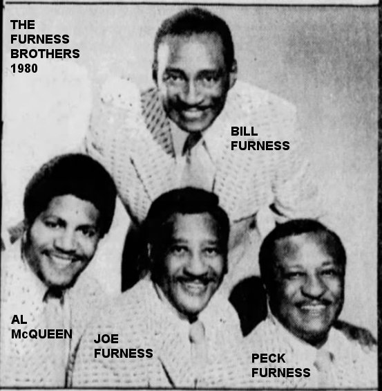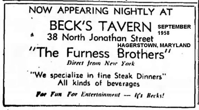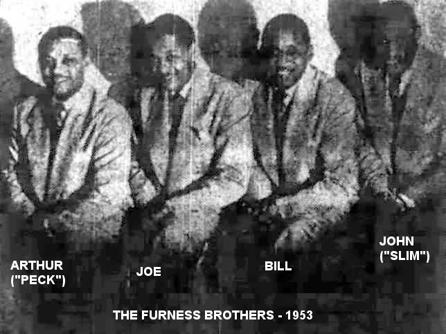 John E. "Slim" Furness, the guitarist and baritone, was born on September 9, 1912 in Oxford, Maryland. The family name was actually "Furniss" (sometimes spelled "Furnis"), and appears that way in many non-newspaper documents (which rules out misspellings). In the 1920 census the family appears as "Furnace", but this isn't as weird as it sounds. "Furnace" and "Furniss" would have a similar sound, with the accent on the first syllable (FURN-iss). Once it was changed to "Furness", the accent would have fallen on the second syllable (Fur-NESS). John had four brothers: James, William, Joseph and Arthur, whom we'll meet later. (There were also three sisters, but they never sang with either of his groups.)