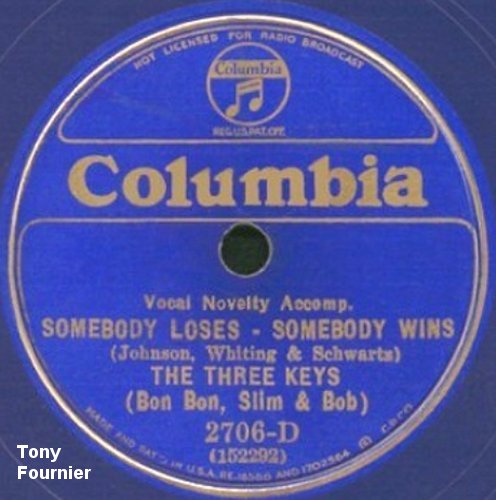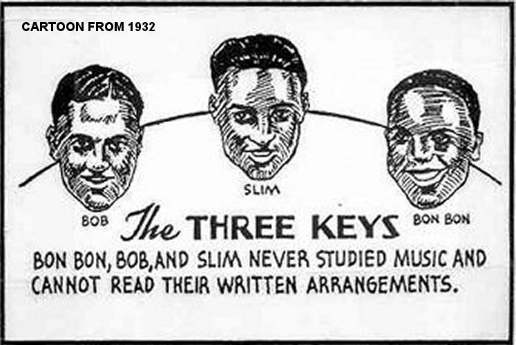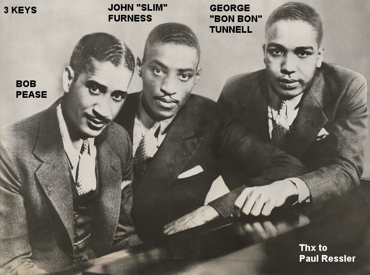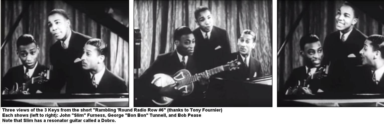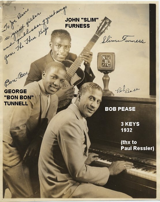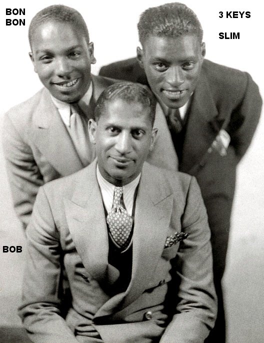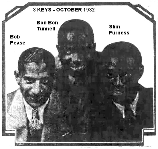 The August 20, 1932 Pittsburgh Courier had a large article about the 3 Keys, when they'd just started their NBC radio show, although (as usual) most of it says nothing interesting. It does tell us that Bob and Slim met the third member, George "Bon Bon" Tunnell, at the Submarine Grill in Chester, Pennsylvania.
