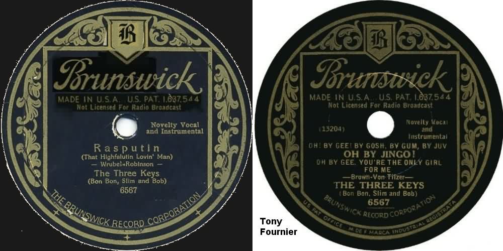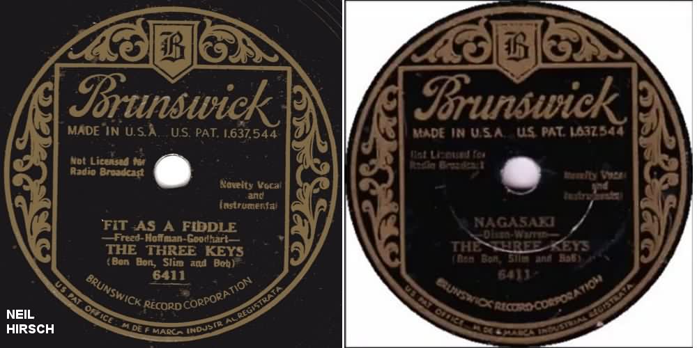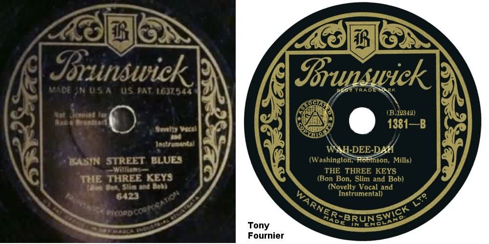 Giving up on Columbia before their first record was even released, the 3 Keys next turned to Brunswick, the label of the Mills Brothers. Here, they held their first session on September 8 ("Jig Time", "Somebody Stole Gabriel's Horn", and the first attempt at "Wah-Dee-Dah"). They were back on the 21st to record "Wah-Dee-Dah" again, along with "Basin Street Blues".