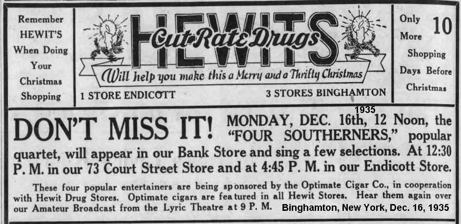 On December 16, 1935, the 4 Southerners appeared at the three Hewit drug stores in Binghamton, New York. The ad said they were a "popular quartet".