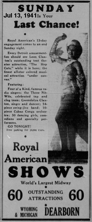 Today, on Royal American's initial visit to one of the best show cities in the U.S.A., Claxton brings 60 all-star troupers to the Dearborn show grounds at Wyoming and Michigan. They run the gamut from "Four Of A Kind" whose quartet songs over WLW, Cincinnati, and for Decca recordings were known as "The Four Southerners". Because their professional name conflicted with NBC's "Southernaires", WLW changed their title to "Four Of A Kind". They will be heard over Detroit stations this week. [See, I don't make this stuff up. (At least not all the time.)]