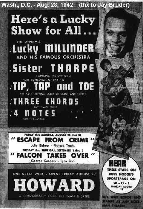 They must have left the show sometime in August, since they spent the week of August 28 at the Howard Theater in Washington, D.C. Also on the bill were the Lucky Millinder Orchestra, Rosetta Tharpe, and dancers Tip, Tap, & Toe.