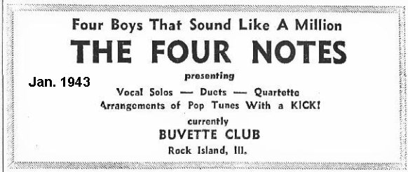 Starting in October 1942, the 4 Notes appeared at the Buvette Club in Rock Island, Illinois. The ad promised "Vocal Solos - Duets - Quartette". They alternated with the 4 Clefs and were still there in early January 1943.
