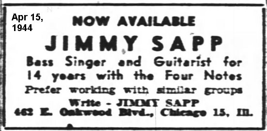 A good reason was that, at some point, the 4 Notes were no more. The April 15 and 29, 1944 Pittsburgh Courier had an ad placed by Jimmy Sapp: