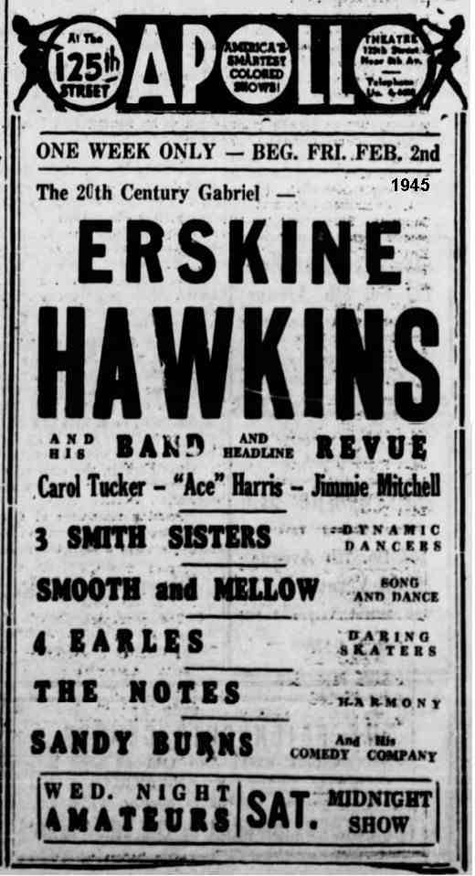 The first appearance I can find for the new 4 Notes was a good one. The week of February 2, 1945, they appeared at the Apollo Theater, along with the Erskine Hawkins band. They were only credited as "The Notes" in the ad (although the "Four Notes" in part of the write-up). The February 3 New York Age said: "Two members of the Notes had been pinch-hitting for the absent Mills Brothers, and then decided to form their own organization." However, Harry Mills was the only brother to be drafted and neither Sapp, Adams, nor Johnson was ever associated with the Mills Brothers.