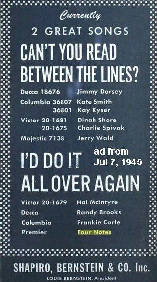 By that time, I suppose, they'd already recorded four songs for Premier, a St. Louis label: "Coffee Five - Doughnuts Five", "Jungle Twilight", "You Sure Look Good To Me", and "I'd Do It All Over Again". The last two were released first, in June 1945. "I'd Do It All Over Again" was a popular song that was recorded by a few other artists. The publisher, Shapiro, Bernstein & Co. took out an ad in the July 7 Billboard listing four versions, including the Four Notes'. However, it took Billboard until December 1 to report that they'd been signed by Premier.
