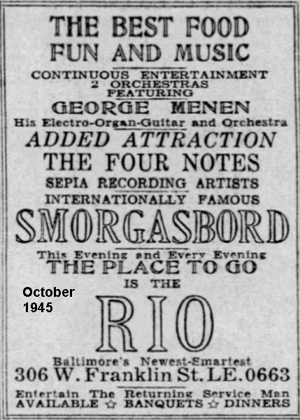 The first photo of the 4 Notes appeared in an ad for Washington D.C.'s Club Bali that said they'd be opening on May 25, 1945. Usually dated much later, it shows Gene Smith, Tommy Adams, Frederick Johnson, and James Sapp. The next day, the whole cast entertained soldiers at Fort Belvoir, a bit south of Alexandria, Virginia.