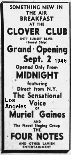 The July 13 Billboard said: "The Four Notes, coming from New York, set for Hollywood's Radio Room." On their way to California, they stopped off for an appearance at McVan's in Buffalo, NY in August.