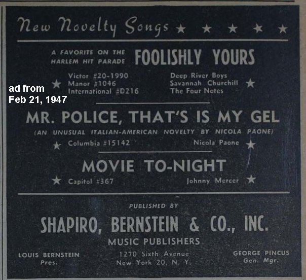 Another Shapiro, Bernstein ad, from late February 1947, showed that the Deep River Boys and Savannah Churchill, as well as the 4 Notes, had released "Foolishly Yours". This is the earliest mention of that 4 Notes recording.