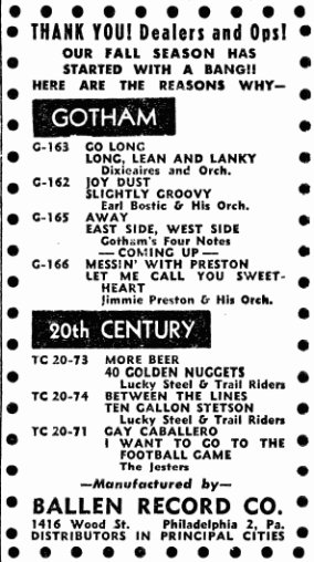 Also in February, Gotham re-released "Away", this time backed with "All By Myself". They then joined Leon Claxton's "Harlem In Havana" revue (still part of the Royal American Shows). This was in the February 21, Billboard: