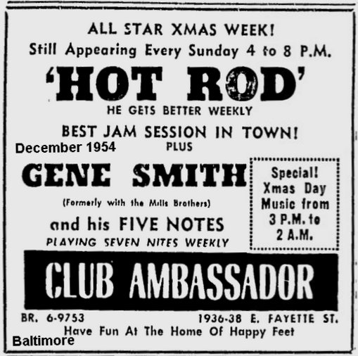 In an ad dated December 19, 1954, "Gene Smith & His Five Notes" appeared at the Club Ambassador in Baltimore. However an article in the Baltimore Afro-American of the same date called them the Four Notes: