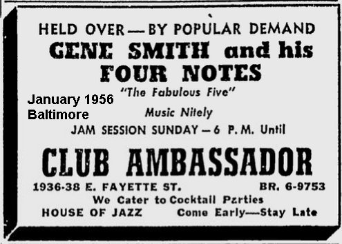 Again, nothing in 1955, but there was another ad for the 4 Notes at the Club Ambassador in January 1956. The last known listing for Gene Smith & the 4 Notes, was at the Carnival Lounge (Baltimore) in August 1957.