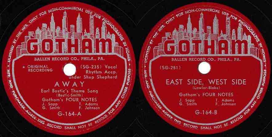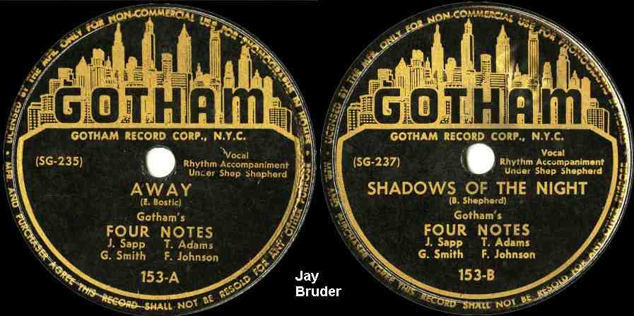 In November 1947, when Gotham released "Away", coupled with "Shadows Of The Night", they were billed as "Gotham's Four Notes".