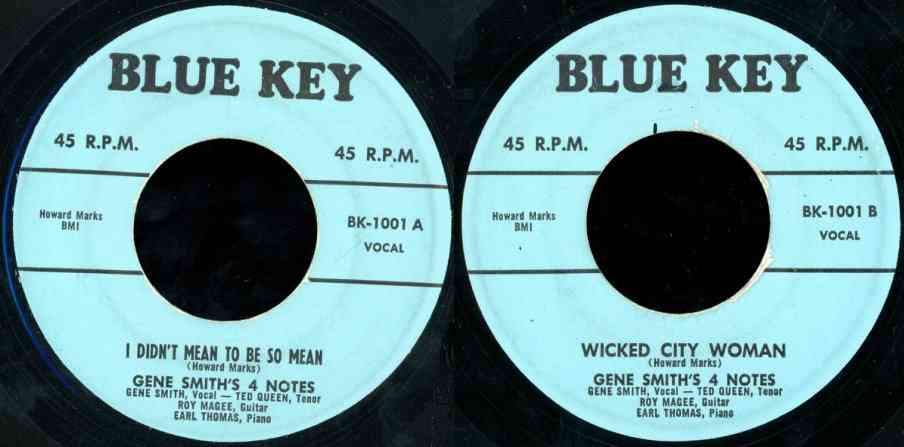 Nothing exciting in 1950 or 1951, but in late 1952 there was a record, on Blue Key, by Gene Smith's Four Notes: "I Didn't Mean To Be So Mean", paired with "Wicked City Woman". The members were listed on the label as: Gene Smith (vocal), Ted Queen (tenor sax), Roy Magee (guitar), and Earl Thomas (piano). However, it's a strange record. "I Didn't Mean To Be So Mean" sounds like it's a precursor to Rock 'N Roll, with all of them singing (although the Red Caps could sound like that). But the flip is clearly a "hillbilly" sound. I believe the label was from Baltimore.