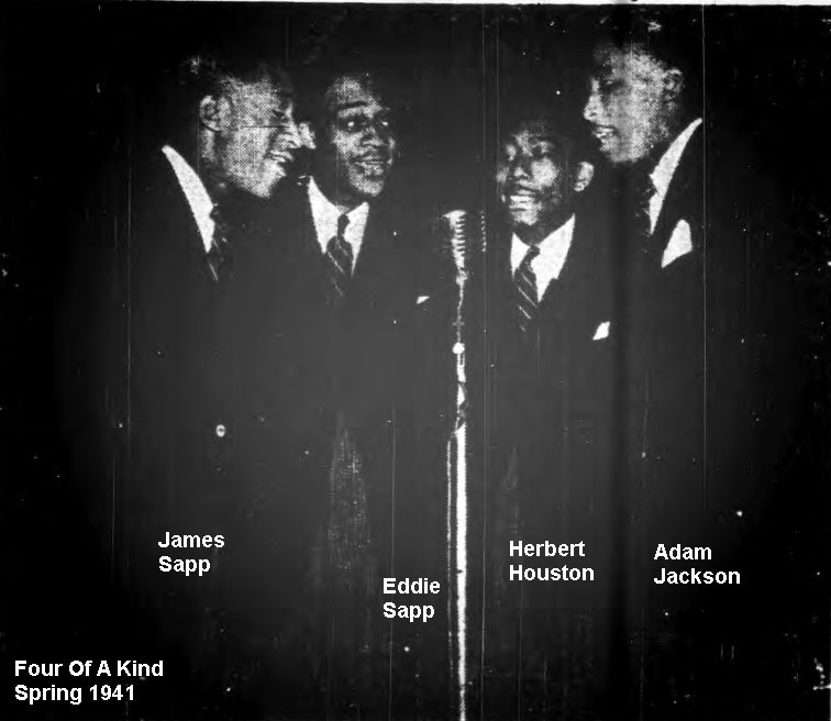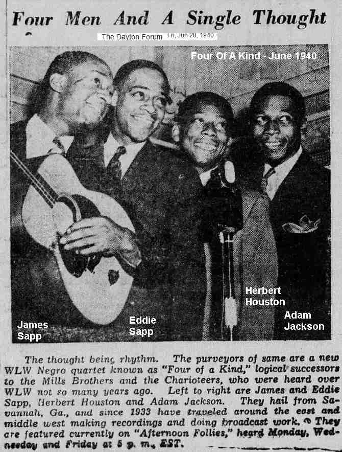 The July 2, 1940 Variety said: "Cinc. 7/2/40 - Also new on the Crosley staff are the Four Of A Kind, Negro vocal quartet from Savannah, Ga. They are James and Eddie Sapp, Adam Jackson, and Herbert Houston and were heard on small eastern stations of late. Quartet warbles hot tunes and spirituals on WLW."