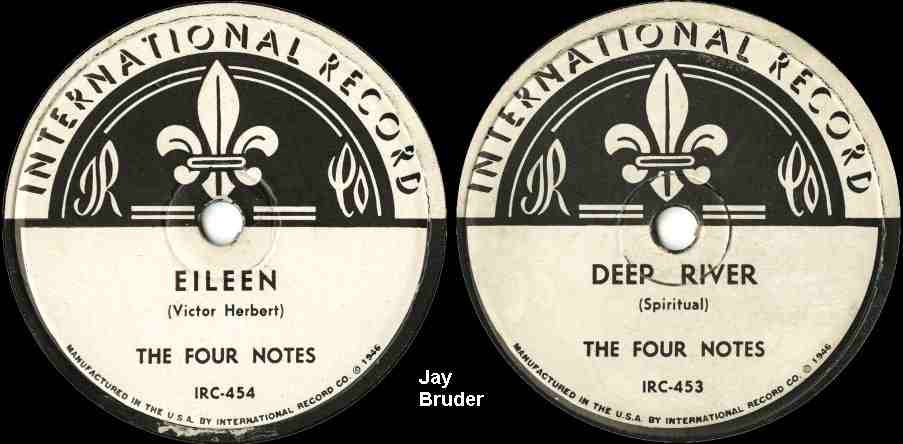The December 21, 1946 Billboard said: "Four Notes, now at Le Ruban Bleu, waxed album for International Records, which will hit counters this week." This confuses me, since the album (a 3-record 78RPM set, called The Four Notes Album) was in Billboard's own Advance Record Releases column back on September 21. However, I guess I have no choice but to date it in December. The International label was from Long Island City, Queens, New York. The six songs were "Re-Bop", "When Day Is Done", "Deep River", "Eileen", "The House I Live In", and "Moonlight Bay". The only one of these I've ever heard is "Eileen".