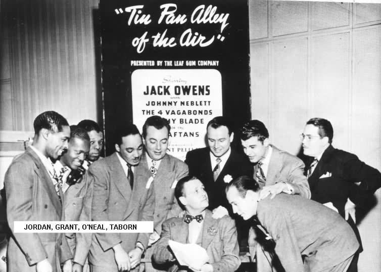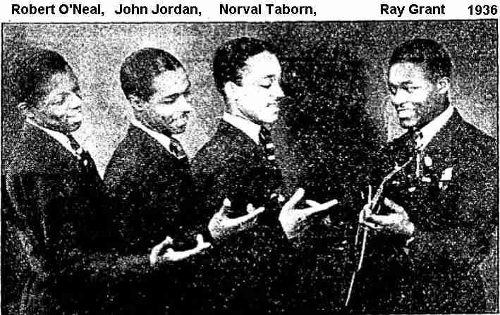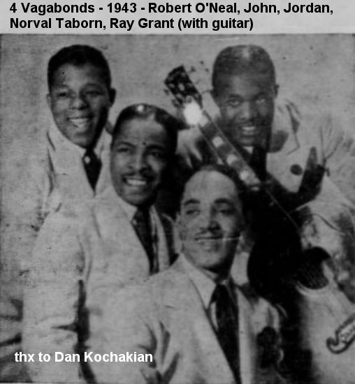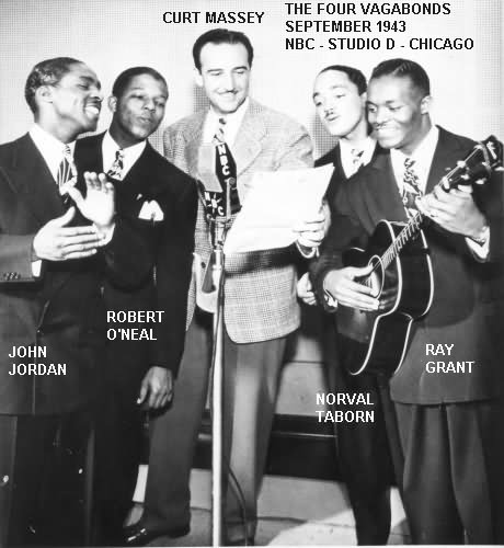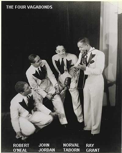 CHICAGO, Mar. 19 - The Four Vagabonds, a singing quartette similar to the Mills Brothers, signed a three-year contract last week with the National Broadcasting Company. George Engles, vice president of the radio concern of New York accepted them after R. M. Kendall, manager of the Artist Service Department in Chi submitted a contract for his signature. Joseph Richardson Jones, dialectician, character delineator and radio announcer at Dave's cafe here brought the lads from St. Louis. Mr. Jones also writes the continuity for the boys. They are Robert O'Neal, John Jordan, Norval Taborn and Ray Grant, bass and guitar player. They are heard on four programs each week. They are the highest paid sustaining [non-sponsored] program vocalists for NBC. Their programs are Mondays 11 a. m., red network. Wednesday on the Breakfast Club program at 9 a. m., blue network. Thursdays 5 p. m., blue network. Starting April 10th the boys will be augmented with a small orchestra of white musicians, "The Originalities". [At the time, NBC had both the red network and the blue network, but it sold the blue in 1942, which then became ABC.]