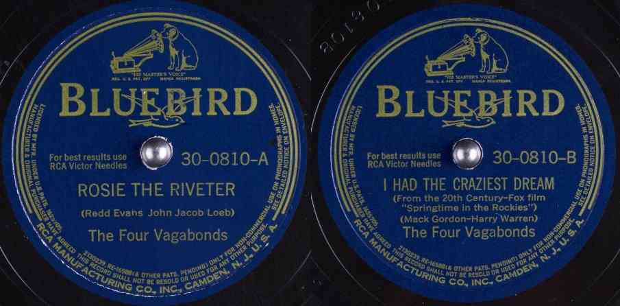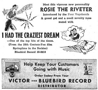 With Ceasar Petrillo's ban still standing, such groups as the Four Vagabonds get all the chance in the world. Using a Mills Brothers style and a ukulele, they are very kind to "I Had The Craziest Dream", Bluebird. Slow and very effective. But I can't say the same for that unpleasant and inane musical nightmare, "Rosie The Riveter", which nobody can redeem. [Pardon me, but I like that song!]