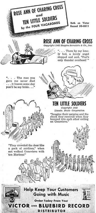 A crisis in the recording industry made the talents of the 4 Vagabonds even more desirable to Bluebird. James Caesar Petrillo, President of the American Federation of Musicians, called a strike, concerning musicians' wages, that crippled the music industry. The first "Petrillo Ban," which prevented all union musicians from playing their instruments at recording sessions, lasted from August 1, 1942 to November 11, 1944. Record companies jammed their studios with artists in order to cut as many masters as possible before the ban took effect, and these were released during the ban. This explains, for instance, why the Mills Brothers cut no discs from 1942 until late 1944. The effect of the strike was minimal upon the 4 Vagabonds, who imitated the instruments they needed anyway. However, on discs such as "Ten Little Soldiers (On A Ten Day Leave)", the group had to substitute a ukulele, which the AFM didn't consider to be a "serious" instrument, for Ray Grant's usual guitar accompaniment.