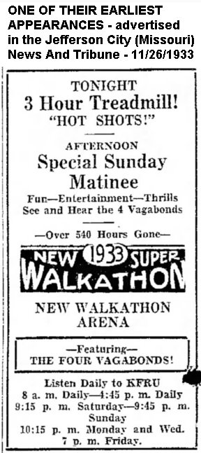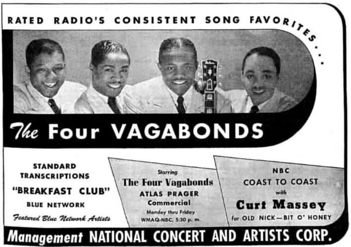The March 7, 1936 Pittsburgh Courier said: "The Four Vagabonds, who have thrilled hundreds of radio listeners, left [St. Louis] Saturday for Chicago for an audition with NBC officials [in Chicago]. Good luck boys."