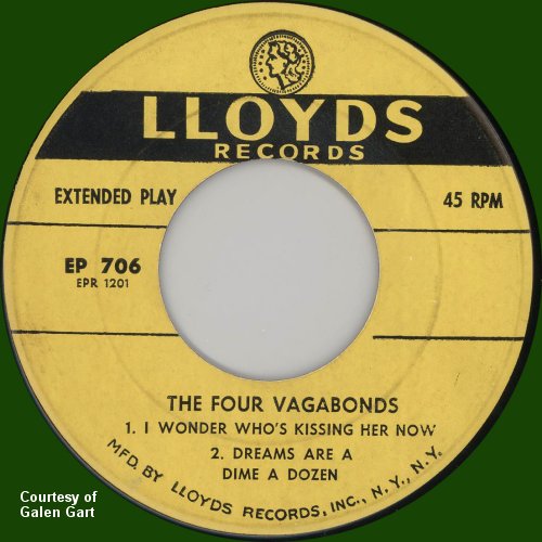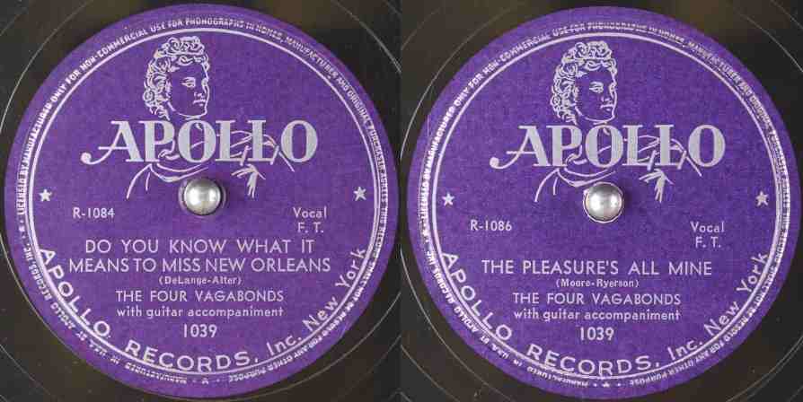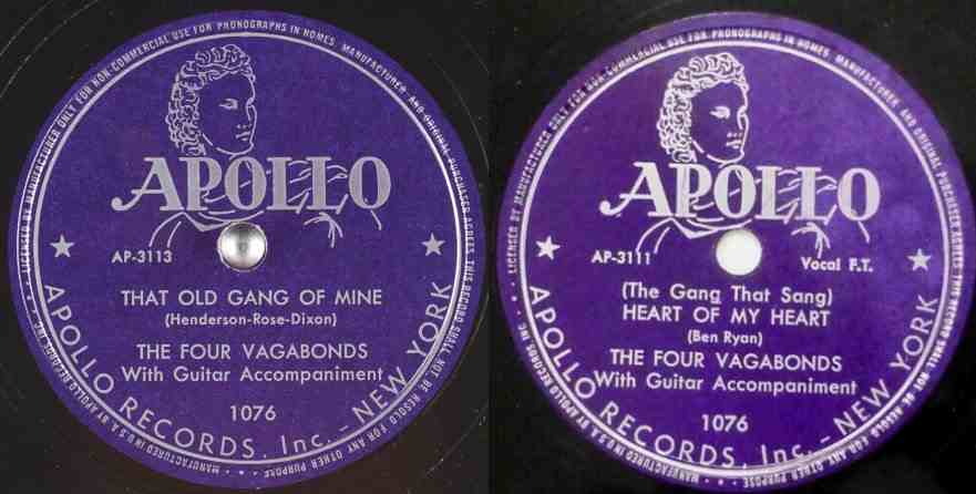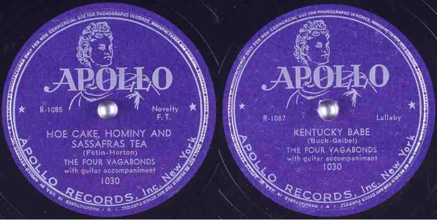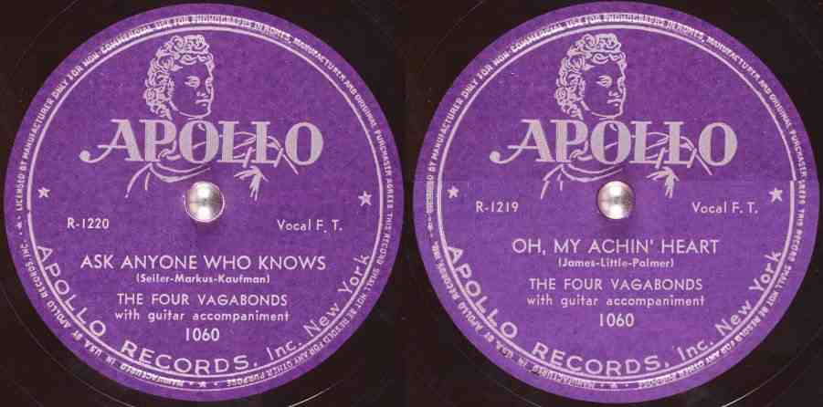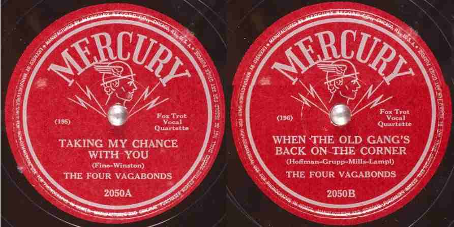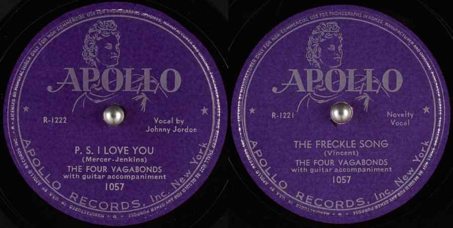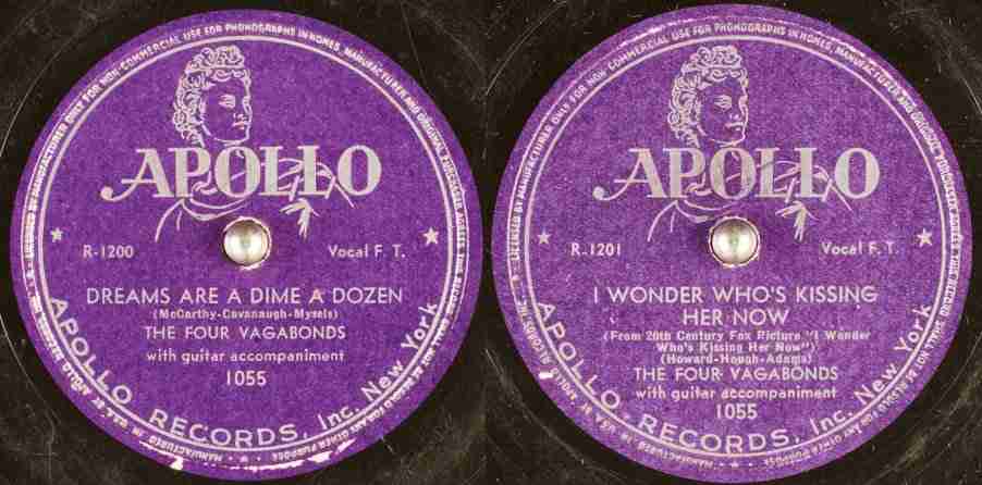 Unfortunately, they weren't the only group of "Four Vagabonds" around, making it difficult sometimes to figure out if an appearance is actually them. There was a similarly-named group around in the mid-50s, after our group had broken up. The white group associated with Arthur Godfrey, usually just called itself the "Vagabonds".]