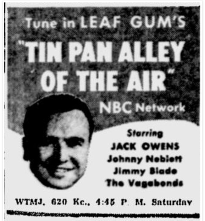 In considering their career, it should be remembered that, unlike the Ink Spots and Mills Brothers, who made their income primarily through record sales and live appearances, the 4 Vagabonds were radio personalities above all else. In January 1945, they were on a new program called Tin Pan Alley Of The Air, hosted by baritone Jack Owens, which was broadcast in WMAQ in Chicago. Sponsored by the Leaf Gum Company, each week the show honored a different American composer. In July 1947 they had a Saturday afternoon show on NBC. They were also guests on King Cole Trio Time (NBC) on January 4, 1947 and the Vaughn Monroe Show on January 17, 1948.