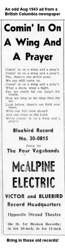 On May 26, 1943, the 4 Vagabonds held their third Victor session. The two songs recorded were "It Can't Be Wrong" and "Comin' In On A Wing And A Prayer", which were issued in June. ("Comin' In" was reviewed as "One of the finest all-vocal versions...".)