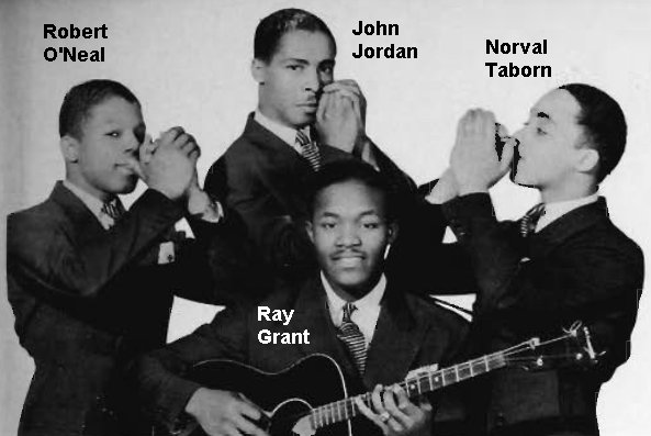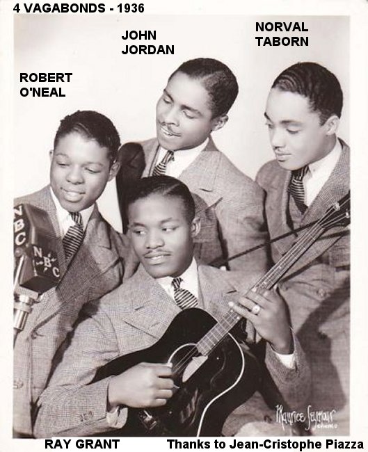 The story of the 4 Vagabonds goes back to 1933 when lead tenor John Jordan and baritone Norval Taborn were singing with a forgotten bass and tenor in Vashon High in St. Louis. Soon after this first taste of group harmony, Taborn located first tenor Robert O'Neal and Jordan recruited bass and guitarist Ray Grant, Jr. Following their first rehearsal session, Jordan recalled that the foursome knew they had a good thing going (even though they were only singing glee club songs at the time). After only three weeks of singing together, the 4 Vagabonds were broadcasting their own show over WEW, the University of St. Louis radio station (first advertised on May 25, 1933). It was during this four-month stint that the Vashon High glee club was broken down into quartets for a school contest. Although the 4 Vagabonds were by far the most popular entry, the judges awarded first place to another group, pointing out that the quartet's following and radio gig indicated that they were likely to stick together anyway. The judges were certainly correct on that score.