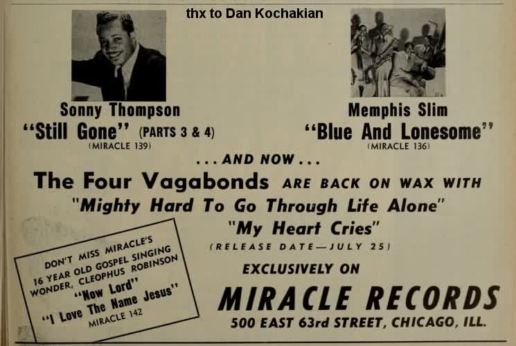 The 4 Vagabonds' had built up a real following. They had fan clubs in Chicago, New York, Cleveland, Detroit, Baltimore. and Atlantic City. Clubs they appeared in during their career include McVan's in Buffalo, Detroit's Circle Club, Club Niagara in Denver, Billy Berg's in Los Angeles, Nick's Show Club in Wilkes-Barre, Pa., and both the Plantation Club and Club Riviera in St. Louis. Among the theaters where the well-traveled foursome appeared are the Fox in St. Louis, the Paradise in Atlantic City, and the Regal, Oriental, and Southtown - all located in the Windy City of Chicago.