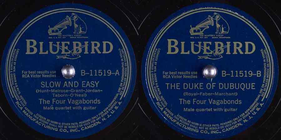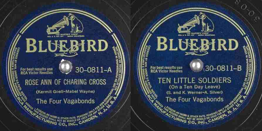 In 1941, Victor's Bluebird subsidiary approached the quartet after having heard them on a radio show. Never under contract, the 4 Vagabonds were paid a flat rate of $3000 for each of their four sessions for Victor, and they also relinquished all royalties. NBC was in charge of managing the group.