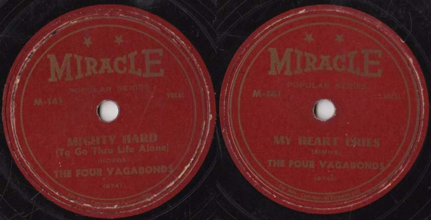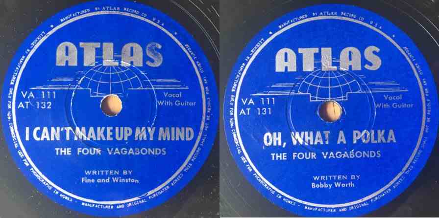 The Bluebird releases, and the single Victor disc, show the talent of the group not only at reading romantic ballads, but also the up-tempo tunes designed to inspire the sluggish workers on the war-oriented assembly lines. They also sang the quasi-spiritual, "Comin' In On A Wing And A Prayer". Despite the popularity of these recordings, however, a postwar slump in the recording industry caused the 4 Vagabonds to leave Victor to record for Robert Sherman's Atlas Records (which had recently been renamed from Premier Records). Jordan said that one regret at leaving Victor was that their discs were promoted far more efficiently there than at any of the subsequent labels.