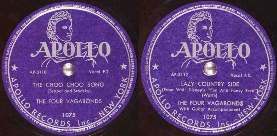 In 1943, the 4 Vagabonds did over 50 known transcriptions for Standard Transcriptions. These recordings (see discography) were pressed up and used by radio stations to work the 4 Vagabonds into many different programs. That is, by playing these recordings, shows could pretend that the Vagabonds were actually in the studio.