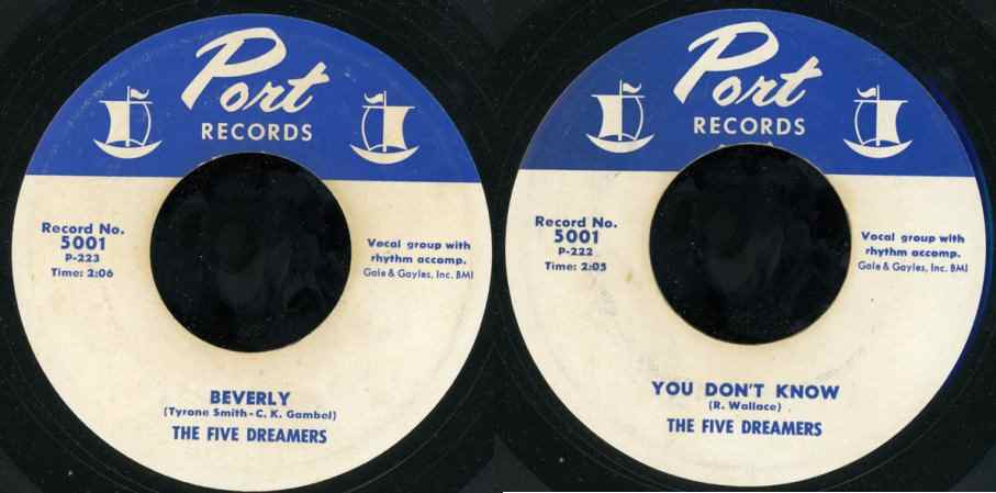 Possibly through Raleigh Randolph, the group got to make some recordings for New York's brand new Port Records, run by 17-year-old Steve Blaine, son of Jerry Blaine of Jubilee Records. Alas, the 5 Dreamers didn't get to go to New York. The recordings ("Beverly" and "You Don't Know"), both led by Stoney Stoner, were done locally, in May 1957. The songs were probably given to them by Randolph, since the writers' names weren't familiar to Nimrod. ("Beverly' was written by Tyrone Smith and Charles K. Gambel; "You Don't Know" was penned by Ricardo Wallace.)