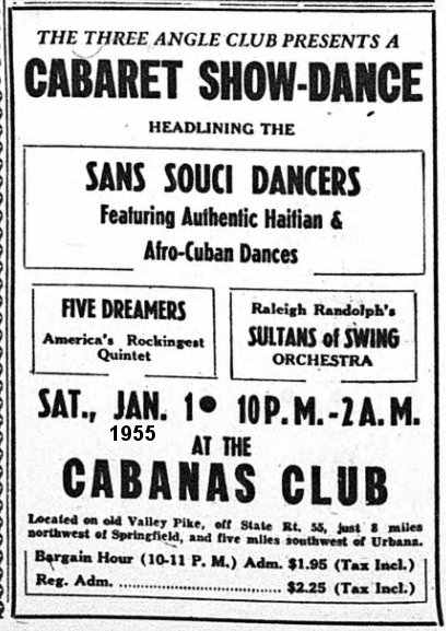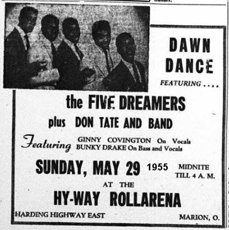 On November 13, 1954, the 5 Dreamers appeared, with the Sultans Of Swing, at the Armory in London, Ohio. On January 1, 1955, it was at the Cabanas Club ("Located on old Valley Pike, off State Rt. 55, just 8 miles northwest of Springfield [Illinois] and five miles southwest of Urbana."). January 28 found them at the Lincoln Ballroom in Columbus, as part of a show put on by the Jack & Jill Club. Then, there was a Dawn Dance (midnight to 4 AM) on May 29, 1955, at the Hy-Way Rollarena in Marion, Ohio. On Christmas Eve, they performed at a dance at something called the Broadview Party Home. Their last newspaper mention was at an NAACP benefit fund-raising banquet, at Columbus' Veterans Memorial Auditorium, on April 14, 1956.