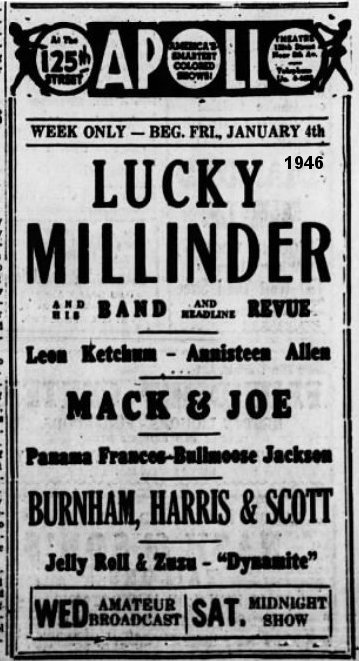 And then, only a short time after joining Millinder, Annisteen found her name in an Apollo Theater ad. The band was there the week of January 4, 1946, including Panama Francis, Bull Moose Jackson, Burnie Peacock, and vocalist Leon Ketchum, as well as Mack & Joe and Jelly Roll & Zuzu.