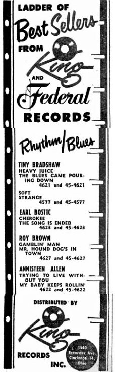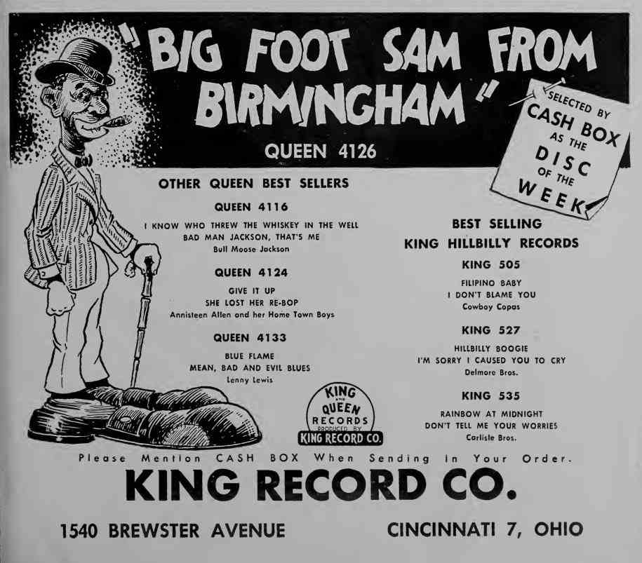Record companies are strange animals. There was a big King ad in the October 7, 1946 Cash Box. It mentions "She Lost Her Re-Bop", as well as Bull Moose Jackson's "I Know Who Threw The Whiskey In The Well", but the ad's screaming title (complete with drawing) is "Big Foot Sam From Birmingham" (recorded, if you remember, at the same session as "She Lost Her Re-Bop" and released as by "Sam Taylor & His Alabama Swingsters"). The ad says that it was Queen 4126 and points out that it was "selected by CASH BOX as the DISC of the WEEK", but fails to mention who it was by!