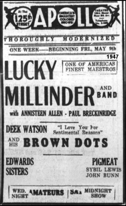 They were back at the Apollo Theater the week of May 9, 1947, along with Deek Watson & His Brown Dots, the Edwards Sisters, and Pigmeat Markham.